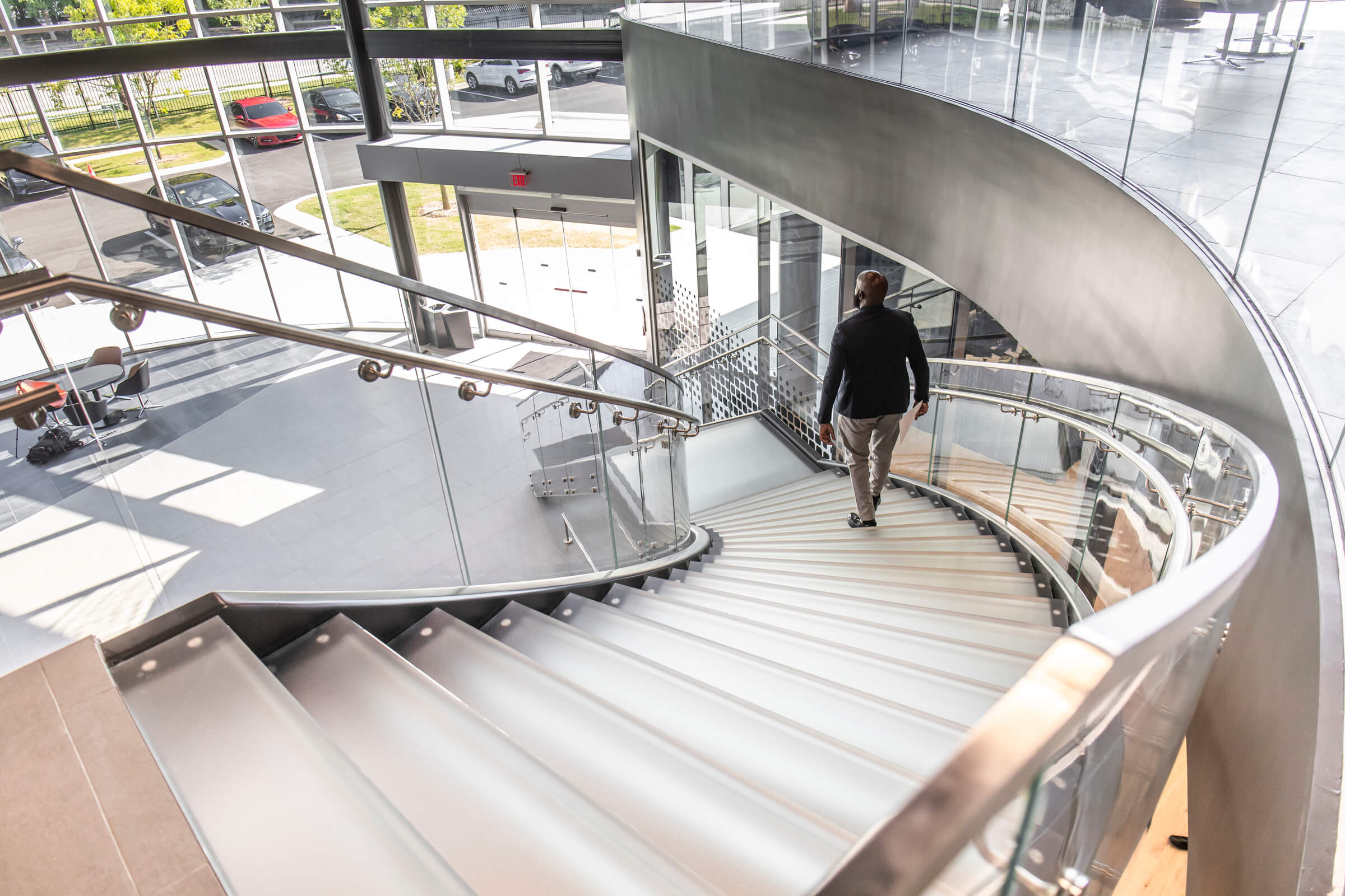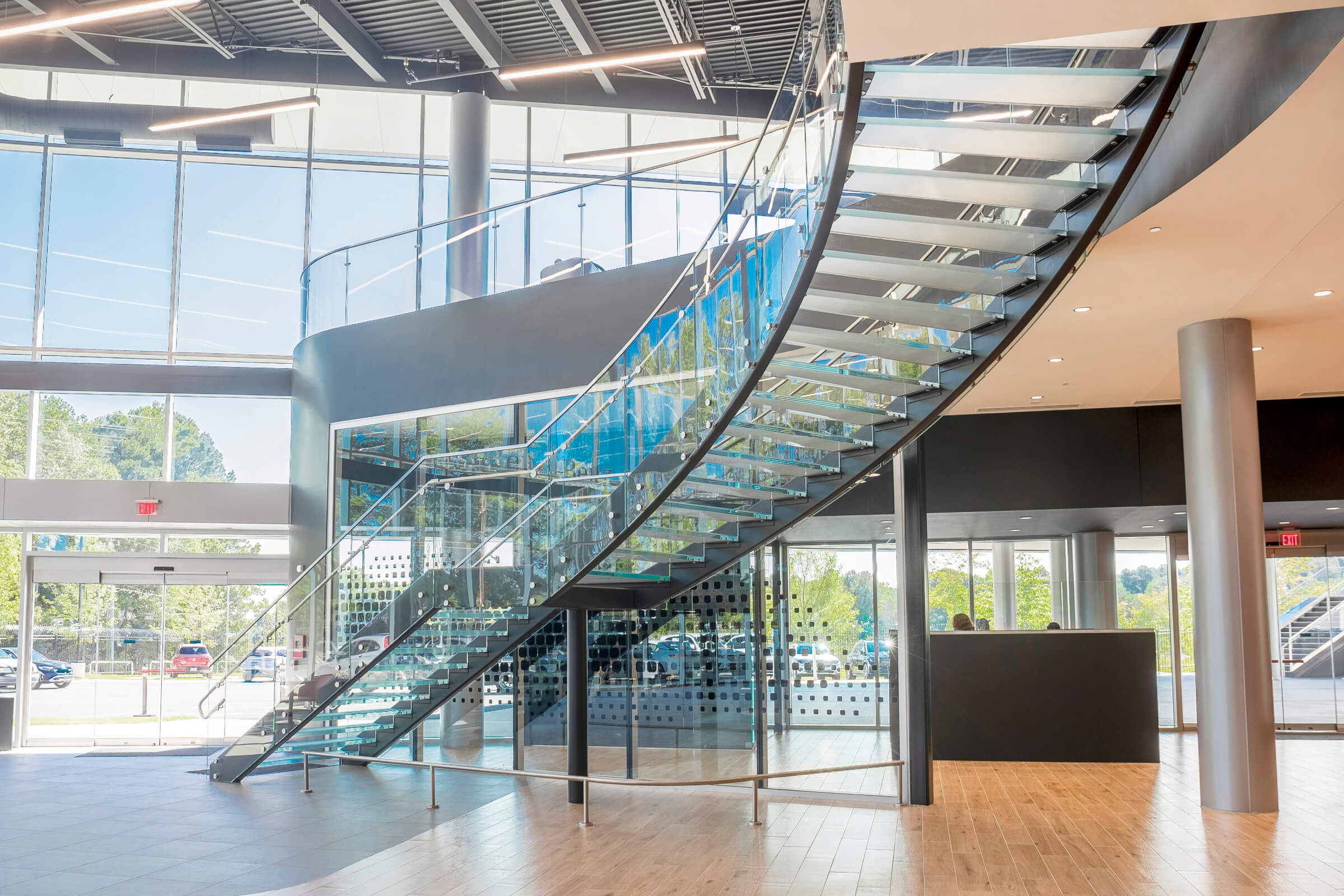 Incorporating a glass staircase in a commercial building creates a striking architectural focal point that enhances transparency, elevates brand identity, and invites natural light into the space.