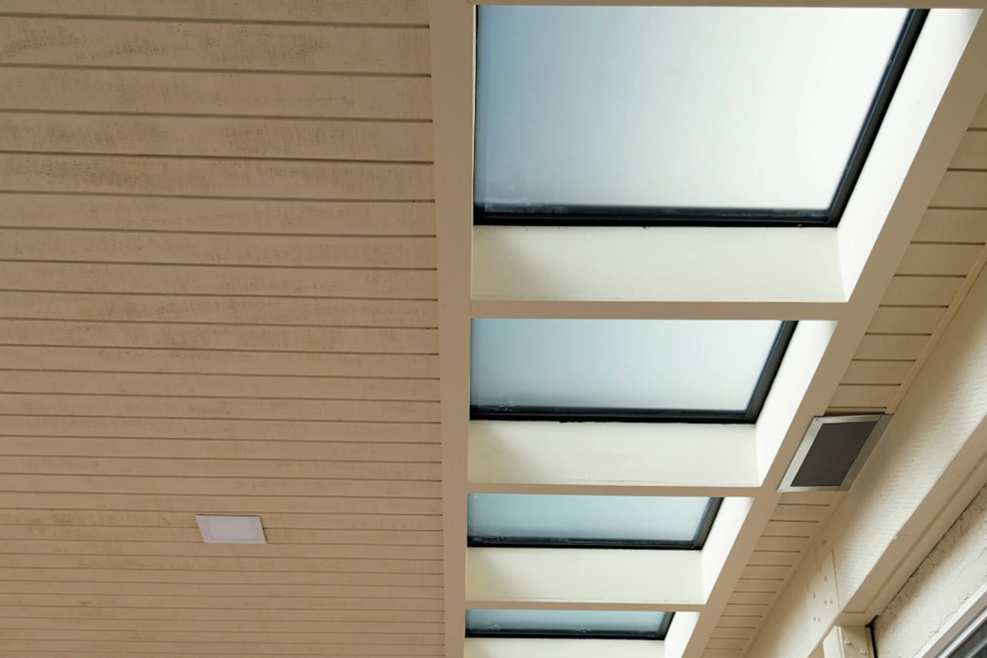Covered outdoor lounge with structural glass skylights showing a finished result of how glass is produced.